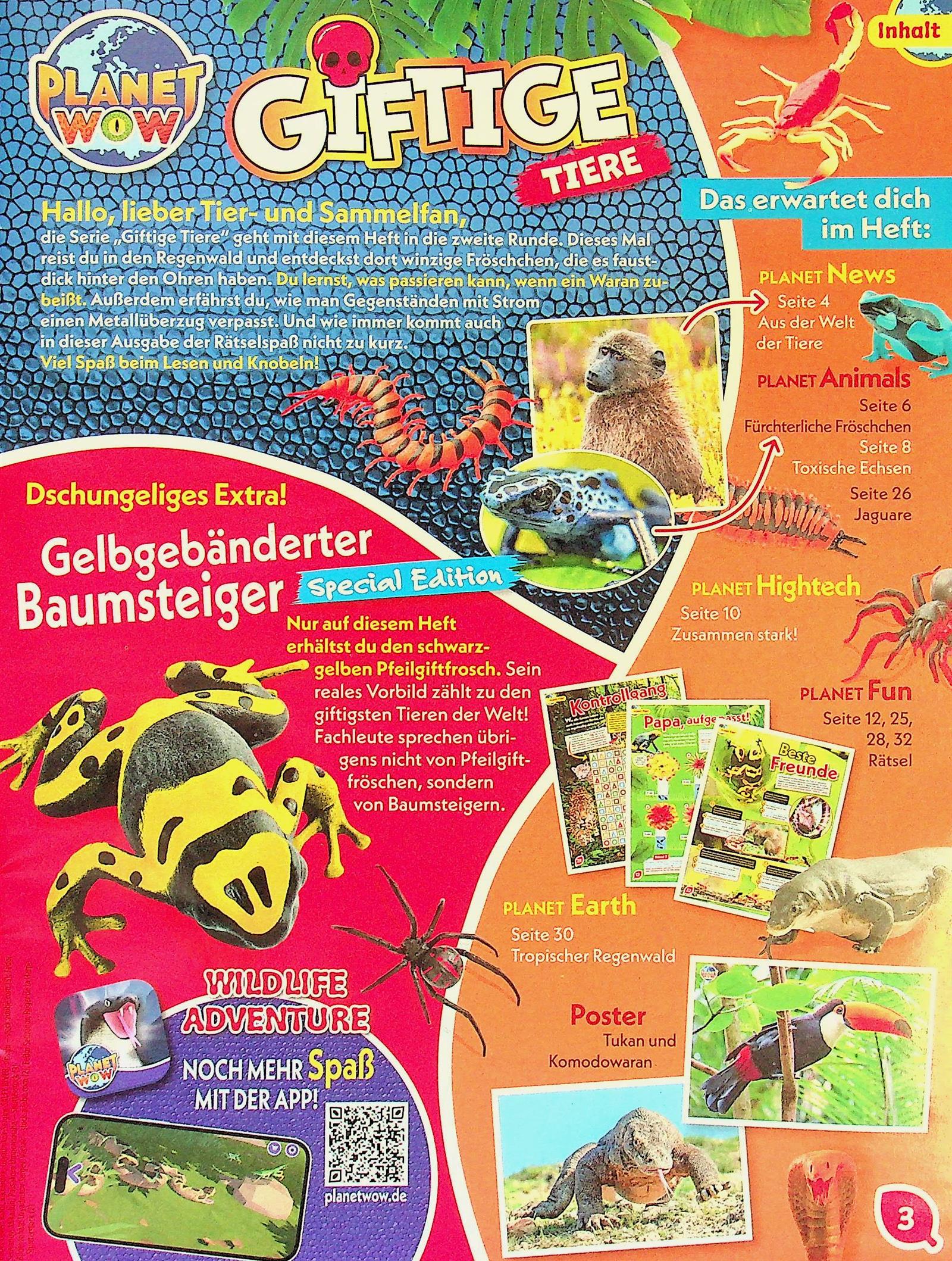 In der aktuellen Ausgabe von PLANET WOW dreht sich alles um faszinierende Tiergeschichten. Winzige, aber gefährliche Frösche stehen im Mittelpunkt, dazu spannende Infos über Paviane vor dem Spiegel, Orcas mit ungewöhnlichem Jagdverhalten und geheimnisvolle Anglerfische. Auch farbenprächtige Paradiesvögel und das erstaunliche Flummi-Phänomen bei Fröschen sind Themen. Das Magazin kombiniert spannende Fakten, verblüffende Effekte und eindrucksvolle Bilder.