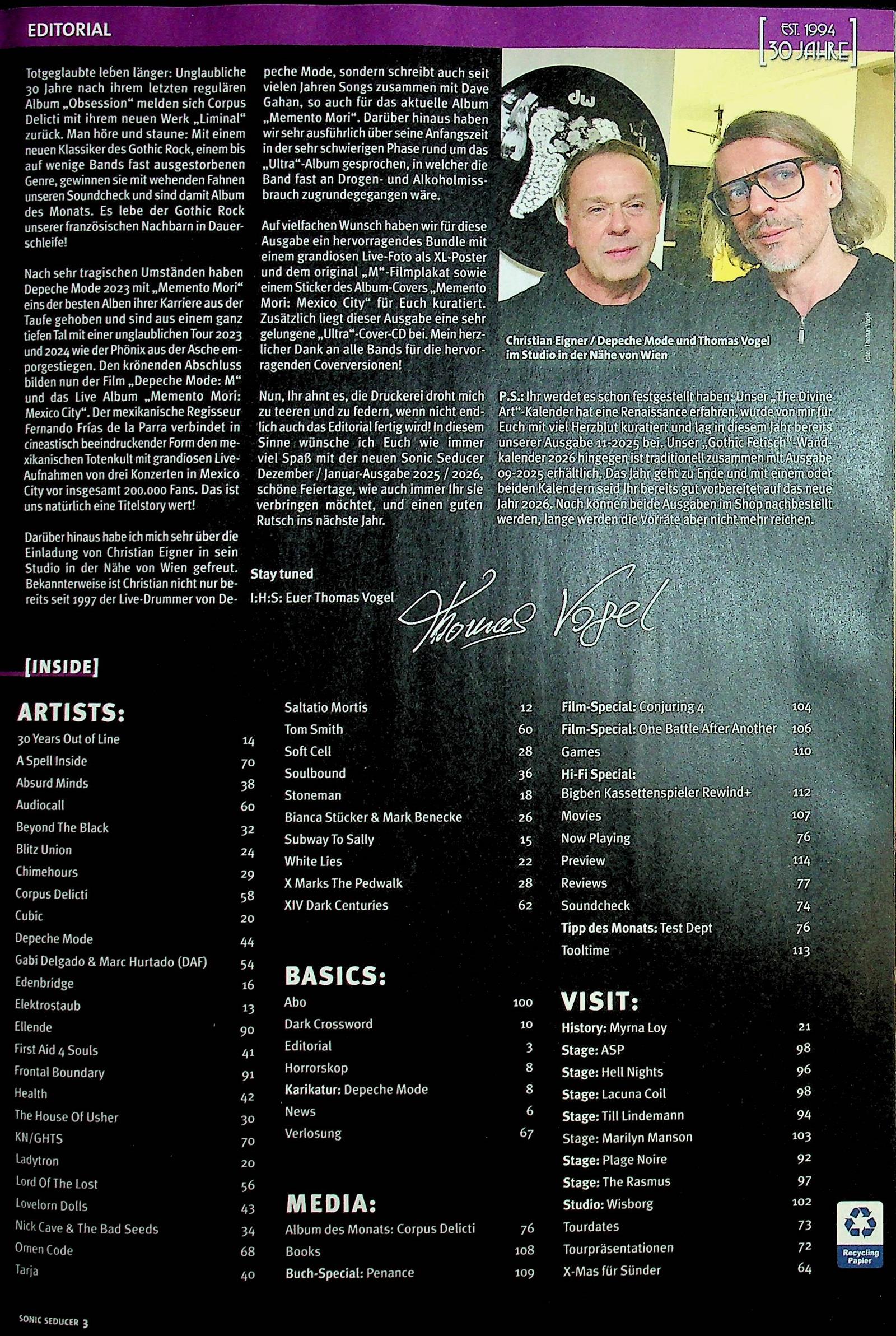 Diese Ausgabe enthält erneut unseren „The Divine Art Kalender“ für 2026, den Chefredakteur und Sonic-Seducer-Gründer Thomas Vogel für Euch wie immer mit viel Herzblut kuratiert hat. Der Titel ist auch diesmal natürlich wieder Programm, und der Kalender selbst zeichnet sich durch besonders fesselnde, archaische und rituelle Motive im Großformat zum Ausklappen aus. Ein Muss für alle, die künstlerische, dunkle Bilderwelten schätzen!