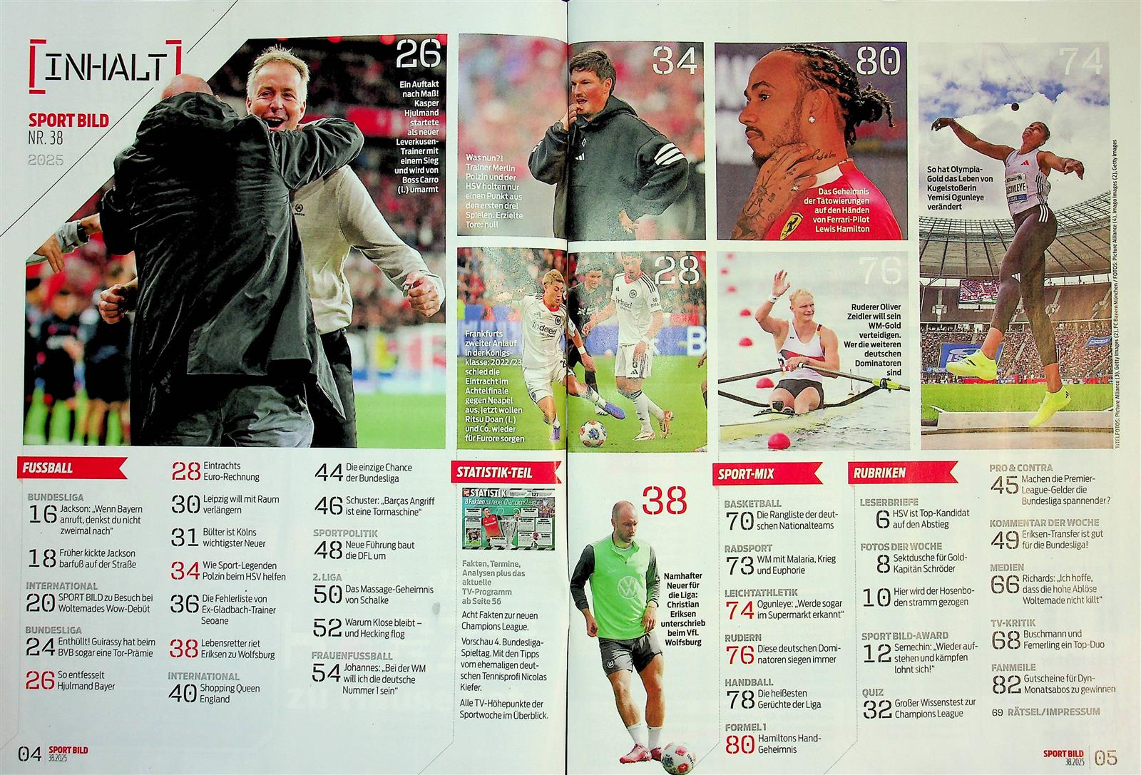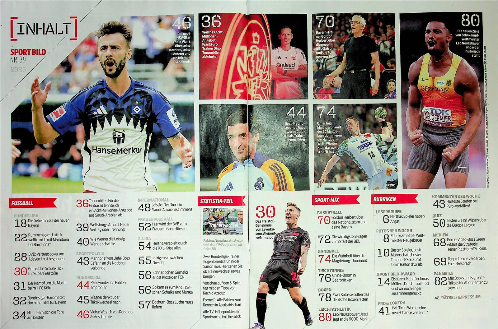 Die Sport Bild ist eines der Leitmedien im Bereich des Sports in Deutschland. In der Zeitschrift gibt es wöchentlich die wichtigsten Nachrichten aus der Welt des Profisports. Die neueste Ausgabe kommt immer mittwochs heraus und ist sowohl als gedrucktes Magazin als auch als ePaper erhältlich. Die Sport Bild behandelt aktuelle Themen durch wichtige Hintergrundreportagen, Portraits, Interviews und vor allem auch durch Kommentare von renommierten Experten.