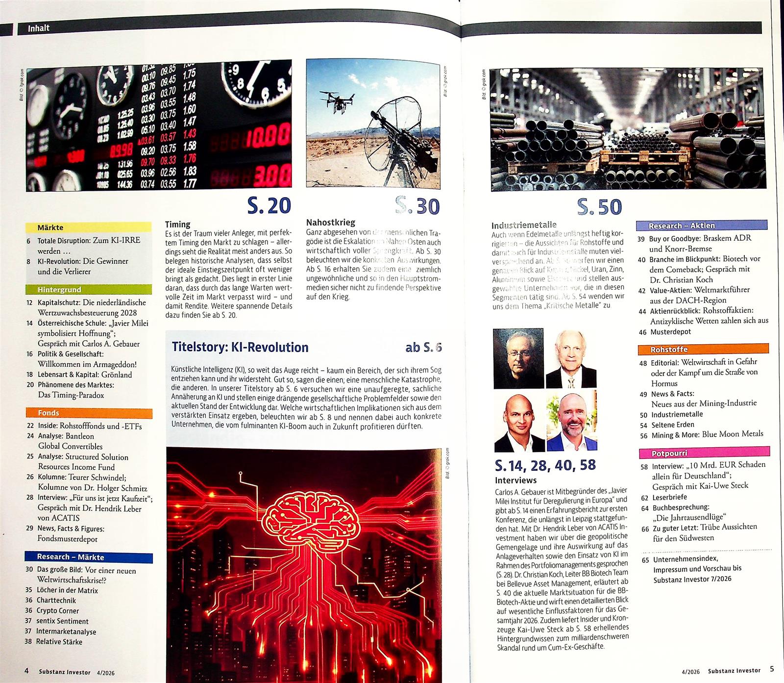 Substanz Investor informiert über Aktien, Anleihen, Derivate, Fonds, Rohstoffe usw. Das aktuelle Marktgeschehen und die Börsenentwicklung werden unabhängig und kritisch bewertet, aussichtsreiche Investitionsmöglichkeiten werden abweichend vom Mainstream vorgestellt, in jeder Ausgabe werden Hintergründe und Analysen verständlich und unabhängig angeboten. Substanz Investor legt dem Leser Informationen nicht nur vor, sondern recherchiert Hintergründe und Trends, berät zu allen Anlagemöglichkeiten und analysiert EU-Märkte und den Einfluss von Wirtschaftsmächten wie die USA, Russland und China auf den deutschen und europäischen Markt. Kritisiert werden nicht nur Unternehmen, Finanz- und Wirtschaftswelt, sondern auch die Ministerien und Regierung. Die Erklärung des Magazins über Interessenkonflikten ist eine ungewöhnliche Facette, die diese Zeitschrift bietet.