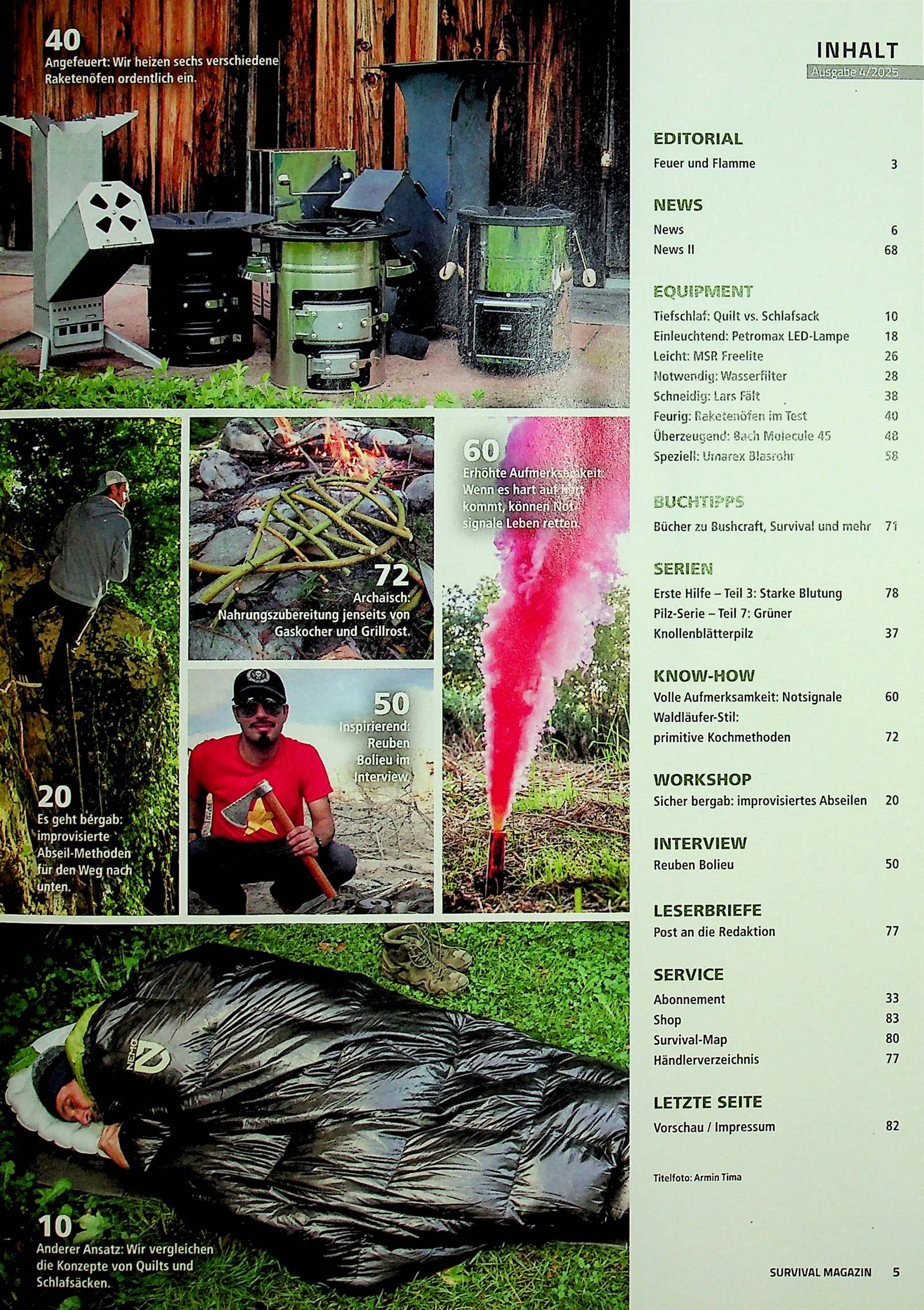 Das Survival Magazin transportiert die Faszination dieser Erlebnisse und liefert dazu das nötige Know-how – mit Workshop-Beiträgen und praktischen Anleitungen, mit Produkttests und Hintergrundinformationen. Interessante Survival-Profis sind ebenso ein fester Bestandteil des Magazins wie spannende Abenteuer.