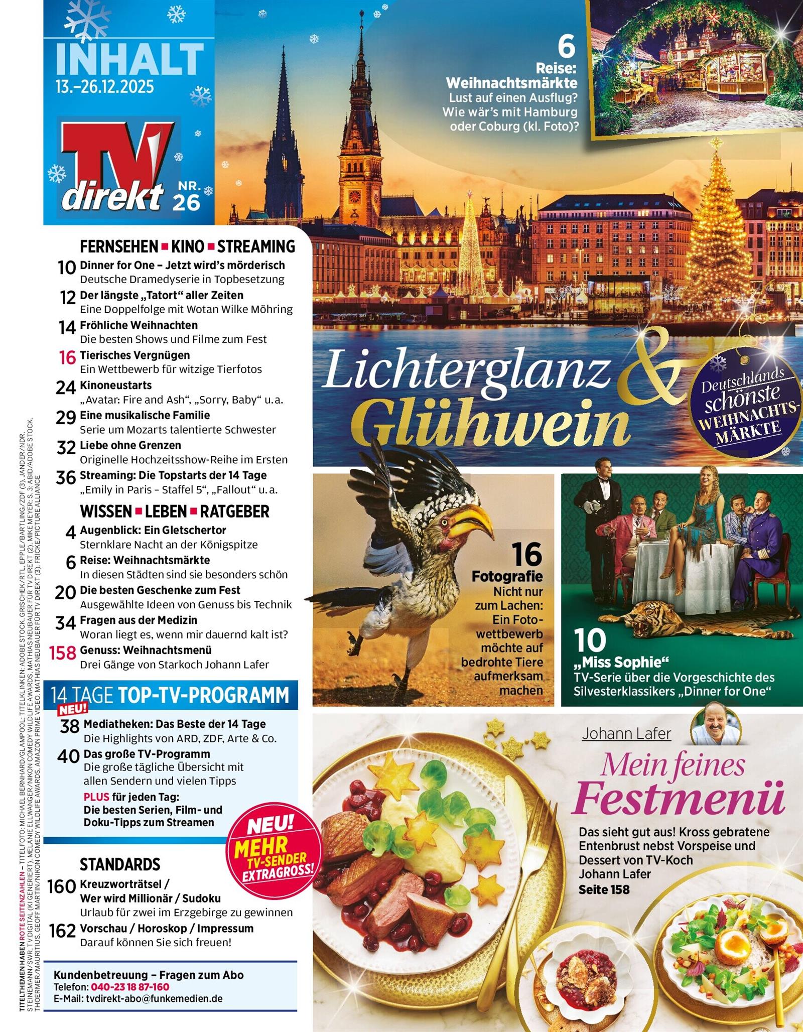 Die TV direkt informiert rund um das Fernsehprogramm in der Kategorie Fernsehen/ TV 14-täglich. Entspricht das Magazin nicht genau den Vorstellungen, stehen eine Reihe von anderen TV-Magazinen in dieser Kategorie zur Auswahl. Zu den ebenfalls preiswerteren Zeitschriften zählen die TV 14 und die TV für mich, die mit einem Konzept aus Programm- und Frauenzeitschrift überzeugt.