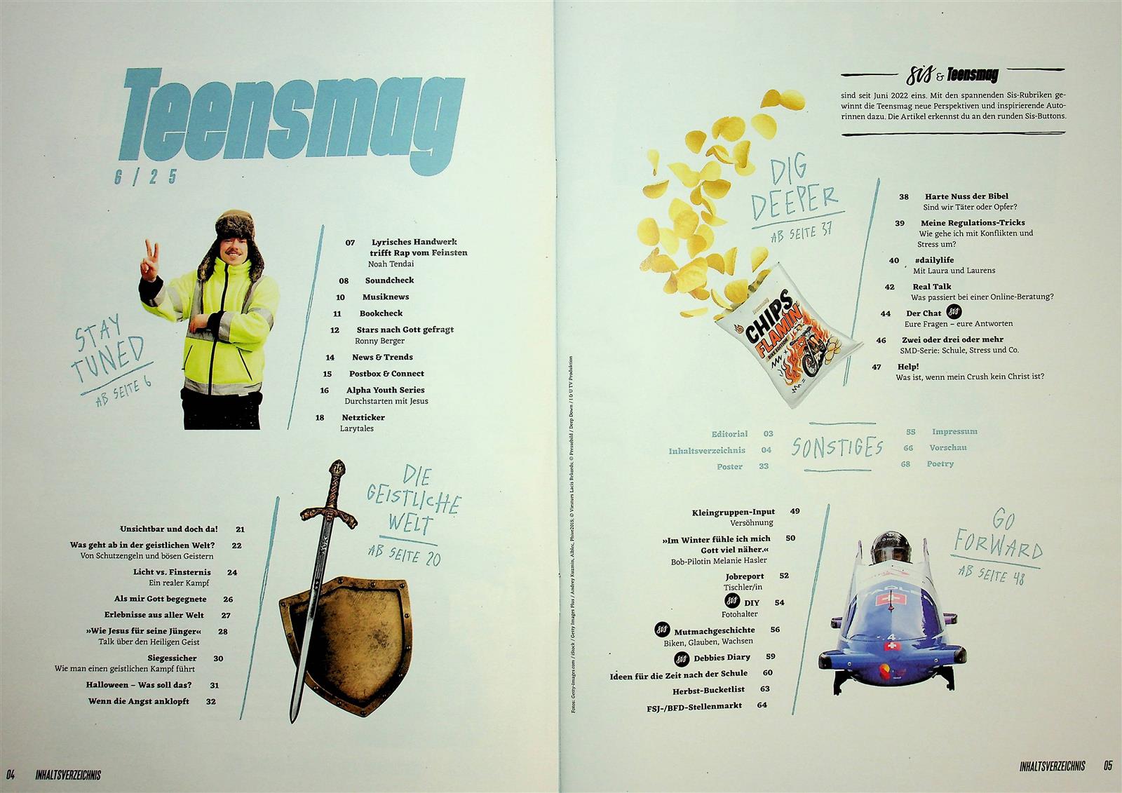 Willkommen im bunten Kosmos der Teens! Hier dreht sich alles um die Zeit zwischen Starpostern, Pickeln, Snapchat und dem ersten Kribbeln im Bauch. Dabei gibt es für Sportfans, Musikliebhaber und Bastelfreaks genauso viel zu entdecken wie für Weltbeweger, Denker und Ratsuchende. Von Freundschaft und Feiern, von Schule bis Selbstzweifel, von Zoff und Zukunft ... das sind die Themen des evangelischen Magazins Teensmag.