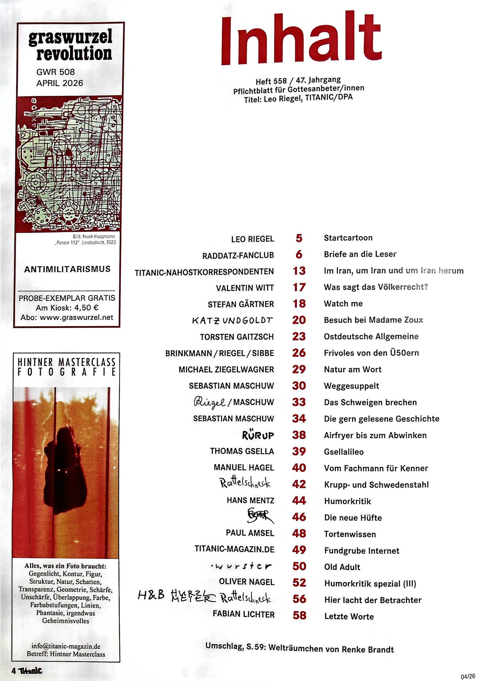 Die Zeitschrift Titanic sorgt mit ihren Satiren immer wieder für Aufsehen. Gegründet wurde das Magazin von ehemaligen Mitarbeitern der Zeitschrift „pardon“, die sich 1979 zusammenfanden. Schon bald wurden die Gründungsmitglieder aufgrund des Sitzes der Redaktion als „Neue Frankfurter Schule“ bezeichnet. Die Titanic erscheint monatlich.
