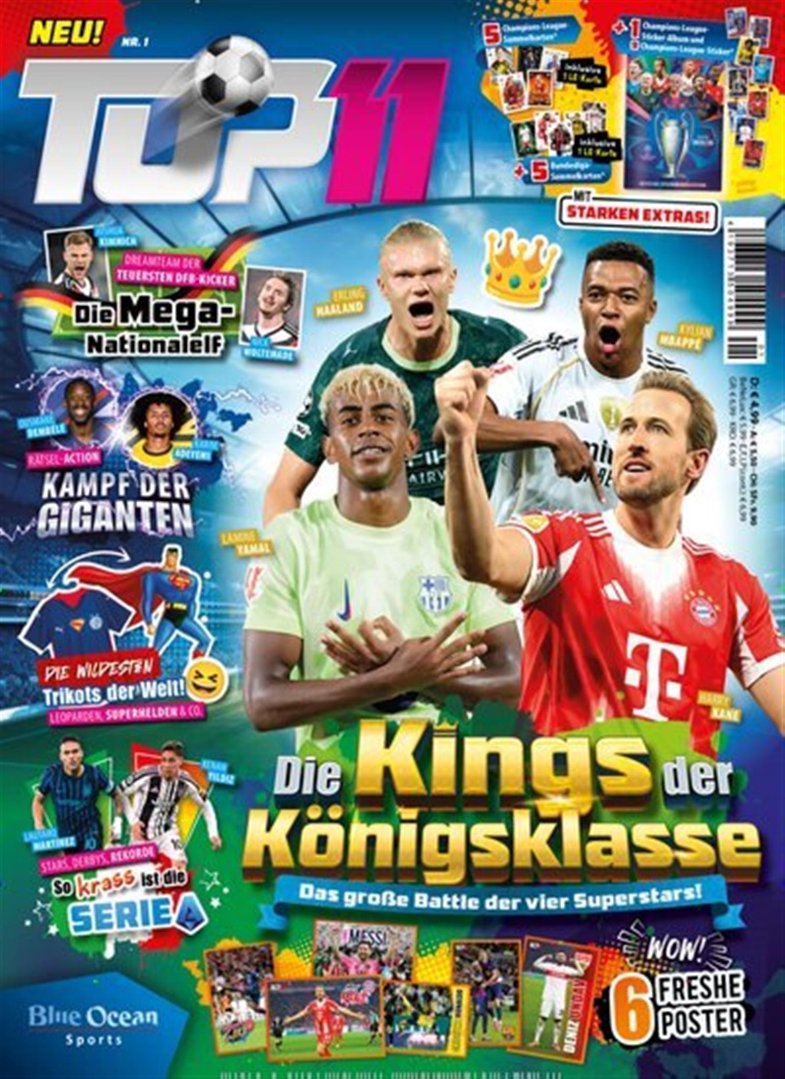 In dieser Ausgabe von Top 11 geht es um Europas beste Fußballspieler, Top-Klubs und ihre Mega-Talente. Themen sind u. a. Englands Shooting-Star Cole Palmer, LaLiga mit Superstars, Derbys und Rekorden sowie exklusive Extras wie Sammelkarten und Poster von Stars wie Mbappé, Kane und Haaland.