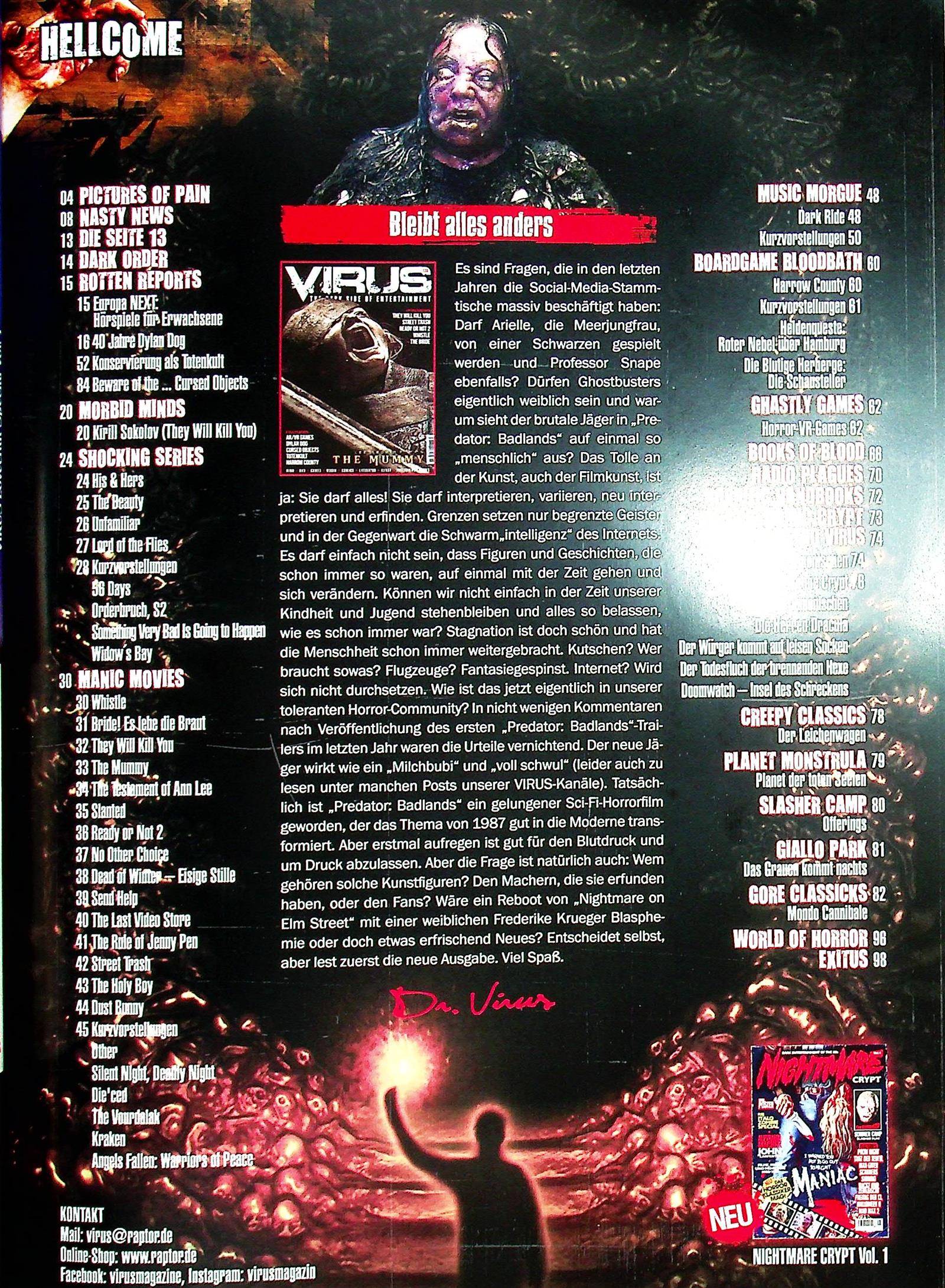 Virus ist nichts für schwache Nerven, denn der Untertitel – The Dark Side of Entertainment – ist Programm im Magazin. Horror, Mystery, Fantasy sowie weitere Spielarten aus dem Unterhaltungsbereich, die so manch einer als abwegig bezeichnen würde, sind sein Inhalt. Fundierte Kritiken zu Horror-Movies (Kino & DVD) und der angrenzenden Genre-Bereiche schaffen Überblick bei den Neuerscheinungen und informieren, was sehenswert ist. Das Segment Games wird ebenso bedacht. Präsentiert werden Fantasy-Games für PC und Konsole – einfach wissen was cool ist und wo sich die Anschaffung lohnt. Damit nicht genug informiert Virus auch über Gruselhaftes aus Literatur und Kunst, bietet zudem einen eigenen Comicteil.