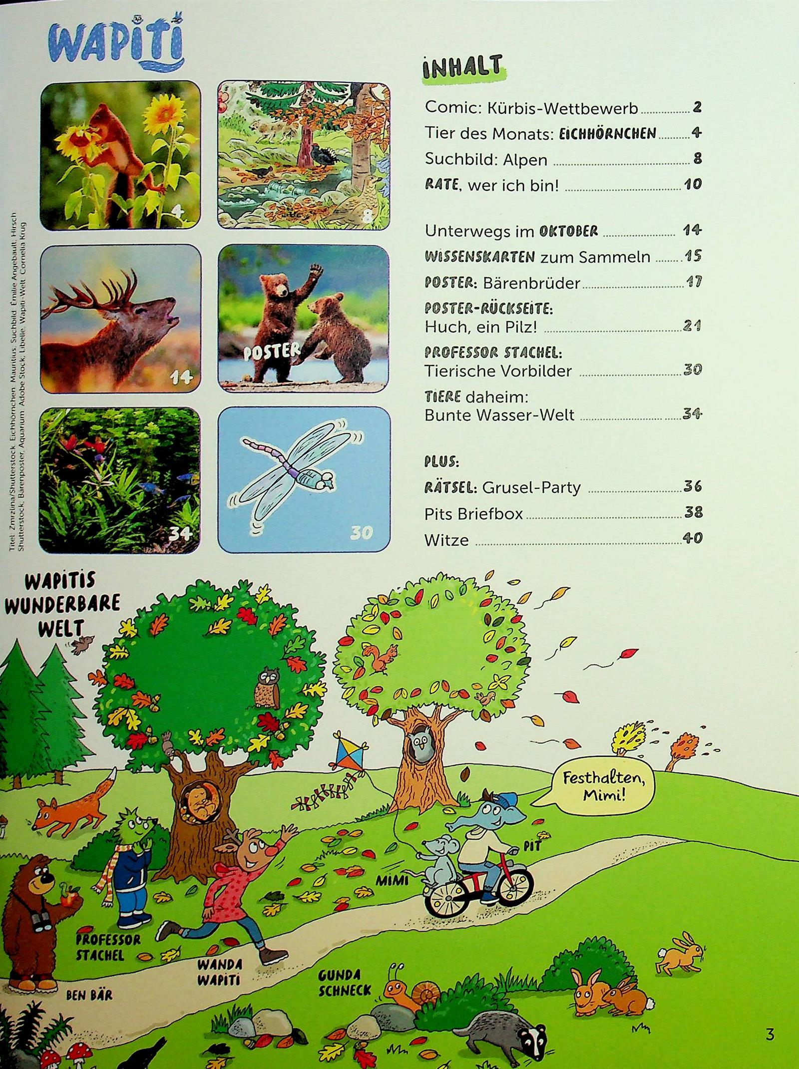Wer sich für Tiere und Naturwissenschaften interessiert, ist mit der Wapiti bestens bedient. Die Zeitschrift mit dem kleinen blauen Elefanten als Wappentier präsentiert in jeder Ausgabe 40 Seiten voller Reportagen, Berichte und Wissenstest zu Tieren aus aller Welt. Jedes Heft kreist um drei große Hauptthemen: das Tier des Monats, Wissen allgemein (ein Wissensgebiet, ein Lebensraum oder eine Tierfamilie) und Professor Stachel, der schlaue Igel, der schulrelevante Infos zu Naturwissenschaft und Tieren erklärt.