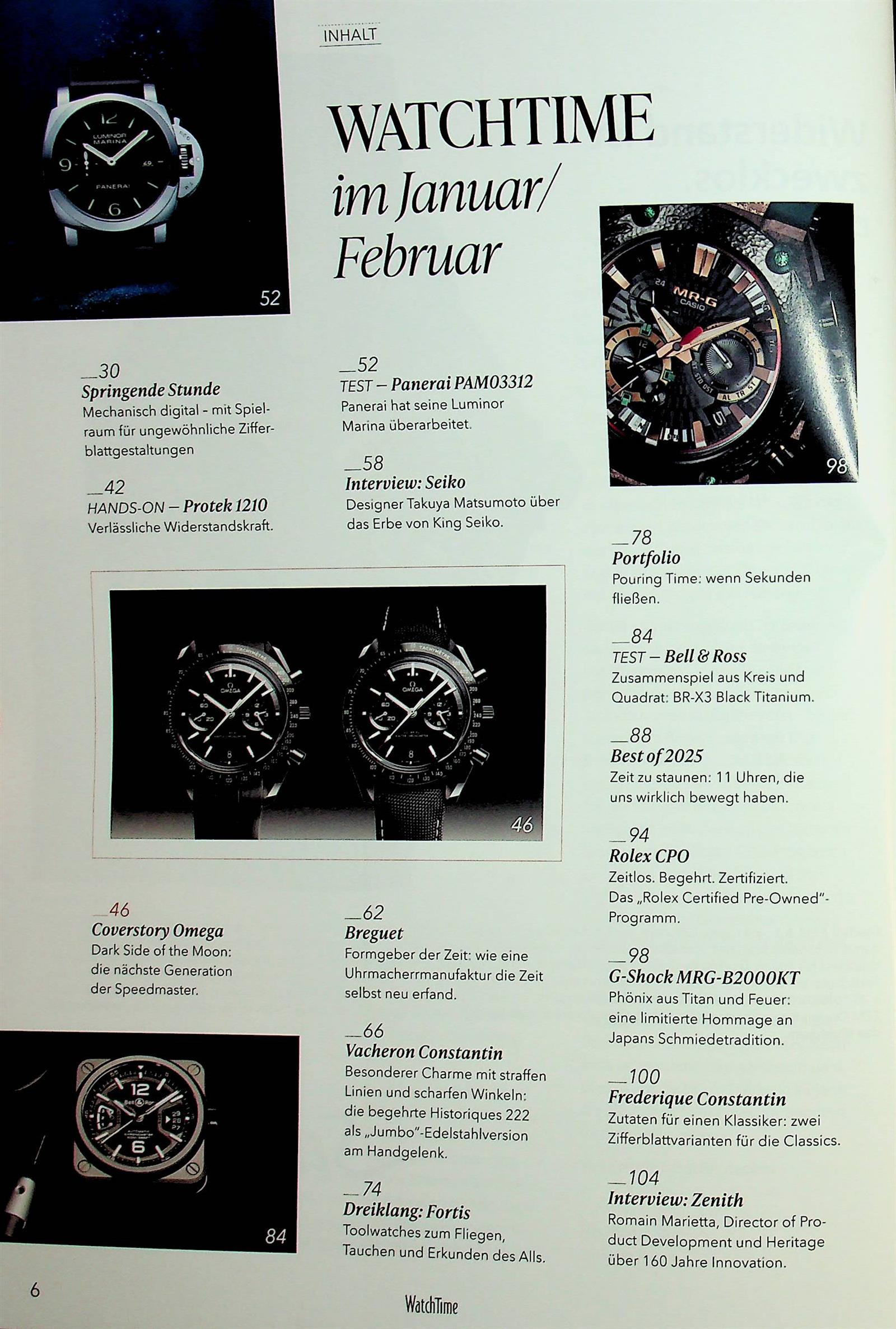 Mit Kompetenz und dem notwendigen Background-Wissen präsentiert WatchTime nicht schlicht Uhren, sondern stellt die exklusiven Zeitmesser in dem Umfeld vor, in dem sie genutzt werden. Gewährt Einblicke in Uhrenmanufakturen und klärt über die Marken auf. Als Schweizer Zeitschrift ist es nah dran an den weltweit bekannten Schweizer Uhrenmanufakturen, verfügt über die notwendigen Kontakte. Auf Einschätzungen der Redaktion ist verlass – WatchTime als führendes Magazin für hochwertige Uhren im deutschsprachigen Raum – ist wissenswerter Ratgeber und zugleich ein Medium, das klare Kaufempfehlungen ausspricht.