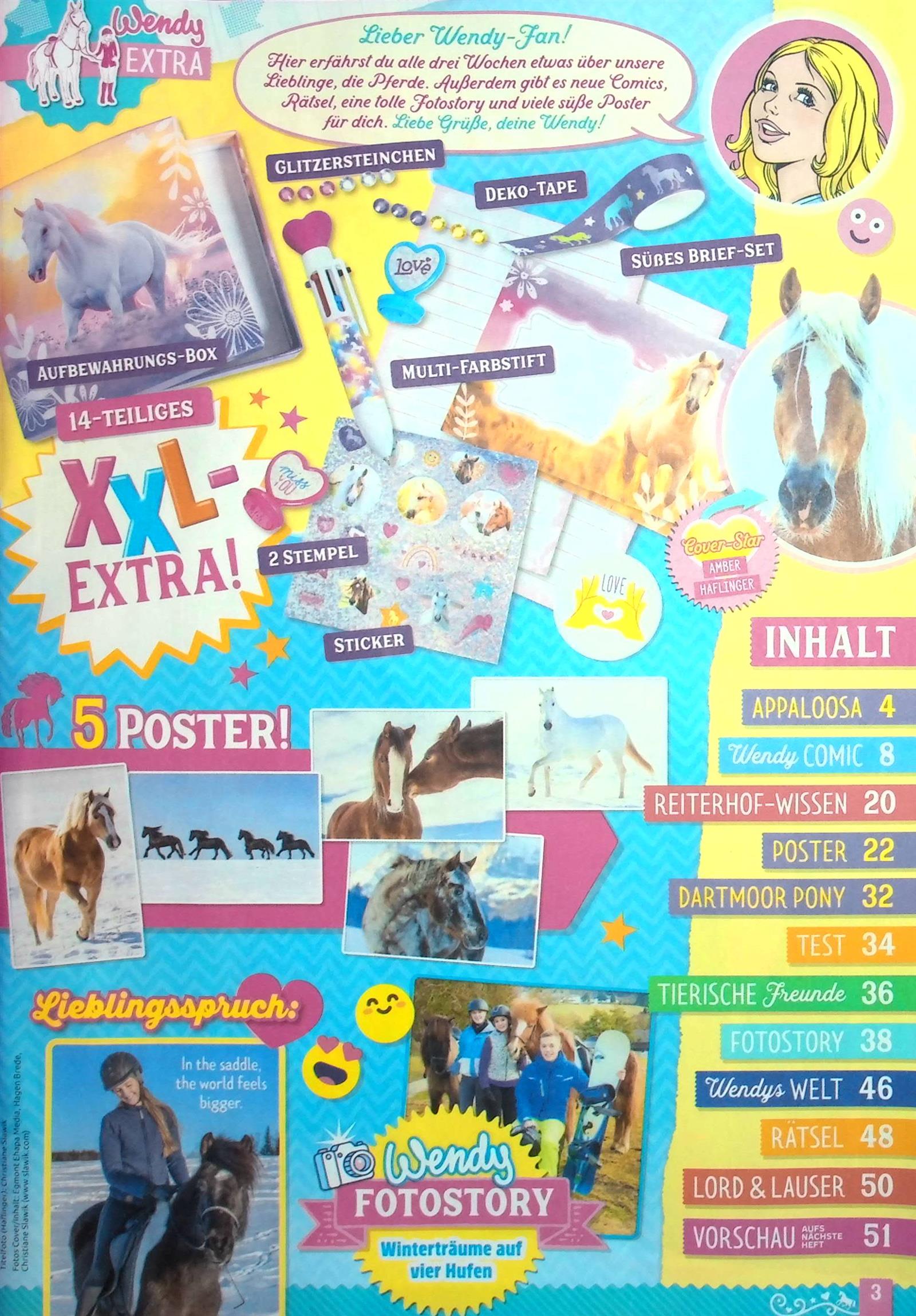 XXL-Extra für Pferdefans mit einem großen Bastel- und Schreibset aus Stickern, Stempeln, Deko-Tape und Aufbewahrungsbox. Dazu gibt es fünf Poster, eine winterliche Fotostory und einen neuen Wendy-Comic. Wissen zu Appaloosa und Dartmoor-Ponys, spannende Reiterhof-Fakten, tierische Freundschaften sowie Tests und Rätsel machen das Heft abwechslungsreich und nah am Pferdealltag.