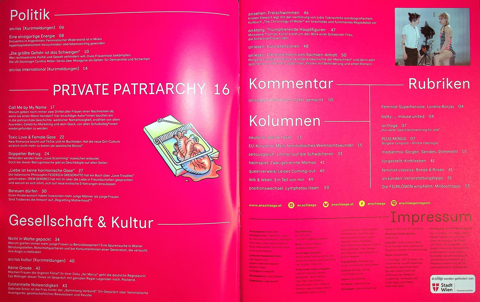 Ausgewogen zählen Artikel und Analysen, Kulturberichte und Reportagen ebenso wie Interviews und Kommentare oder Glossen und Bildkolumnen zu den durchweg präsentierten feministischen Standpunkten in an.schläge.