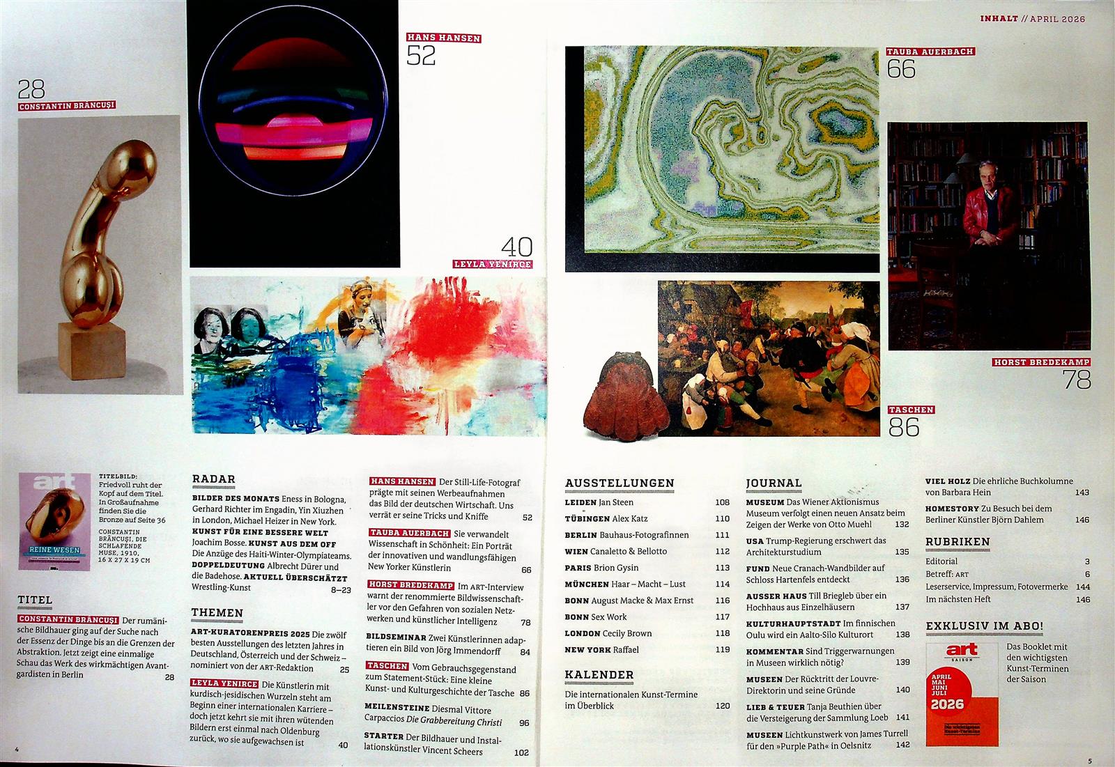 ART ist zu finden unter den Zeitschriften zur Bildenden Kunst . In dieser Kategorie finden Sie noch zwei weitere empfehlenswerte Magazine, die sich ausschließlich mit Zeitgenössischer Kunst auseinandersetzen: die Art Review und die zweisprachige (deutsch/englisch) Spike Art Magazin. Ein Heft für Entdecker künstlerischer Werke ist die Artmapp.