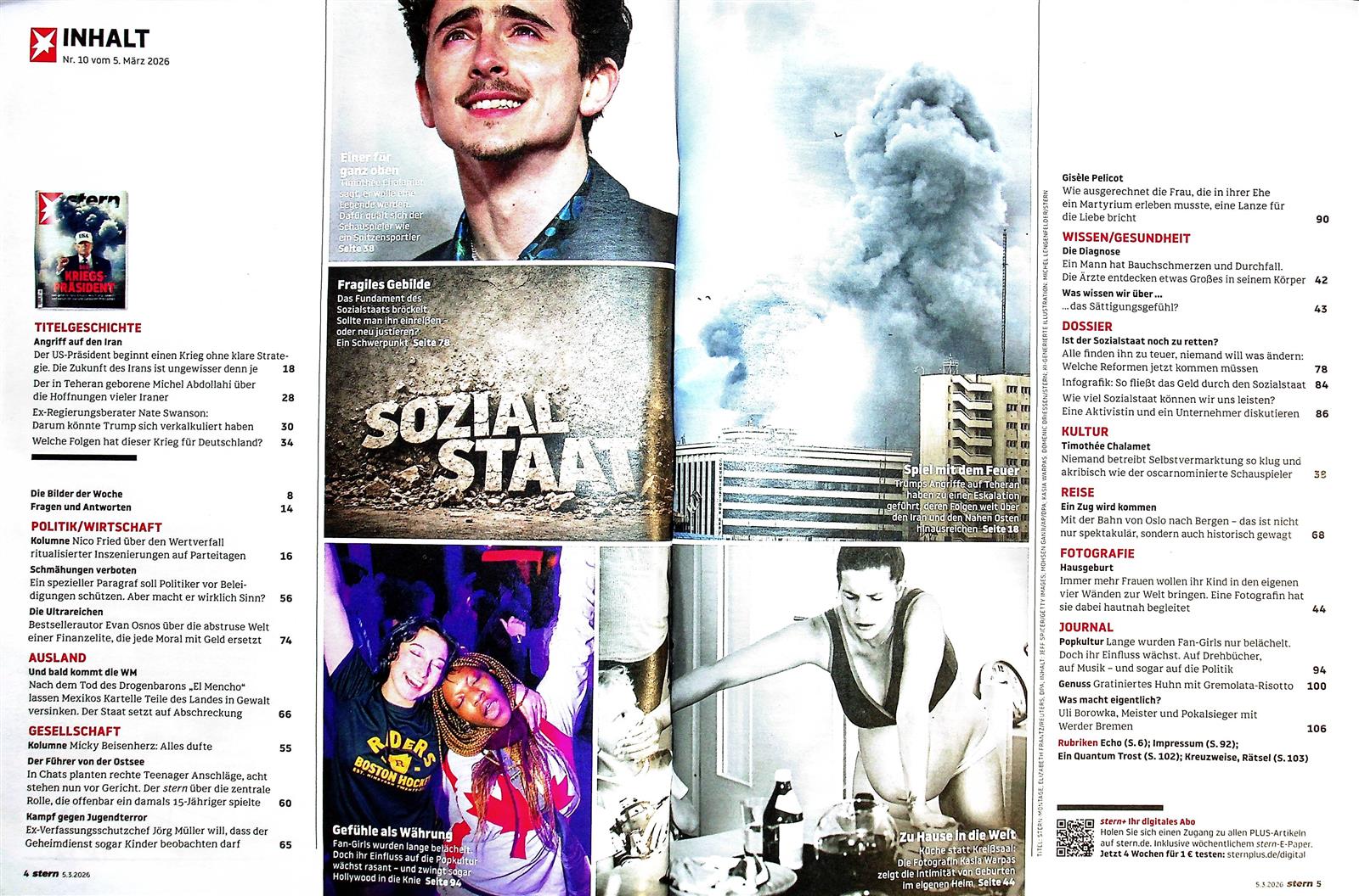 Seine besondere Themenmischung aus gesellschaftsrelevanten Themen und unterhaltsamen Extras, die klare Haltung und seine großzügige Optik zeichnen das von Henri Nannen gegründete Magazin Stern aus. Investigativer Journalismus und aufwendige Recherchen sind Basis für gründliche, in die Tiefe gehende Informationen und seine verlässliche Qualität in der Berichterstattung. Kombiniert werden sie mit herausragenden Bildern aus den Kameras der renommierten Fotojournalisten. Nicht verwunderlich, dass das Magazin für seine Optik immer wieder von Fach-Jurys mit Preisen ausgezeichnet wurde.